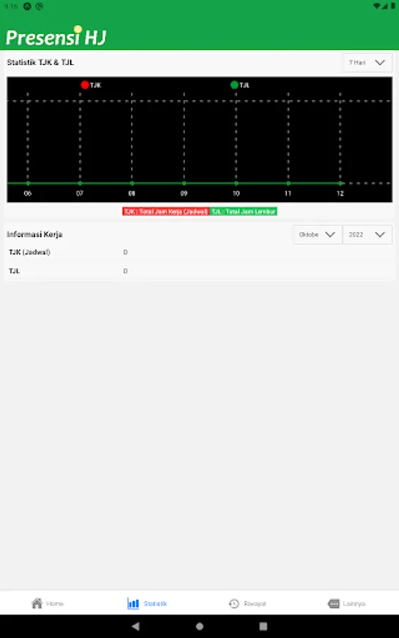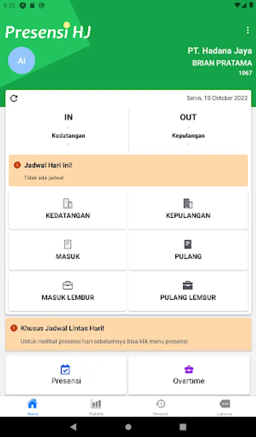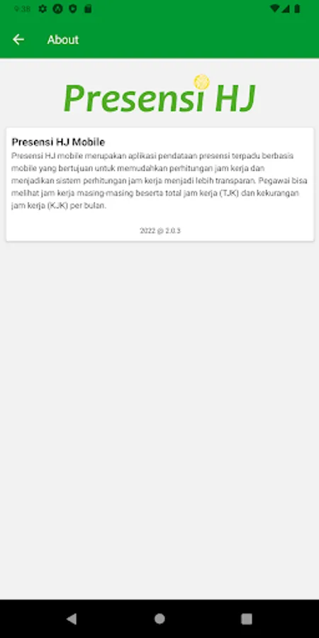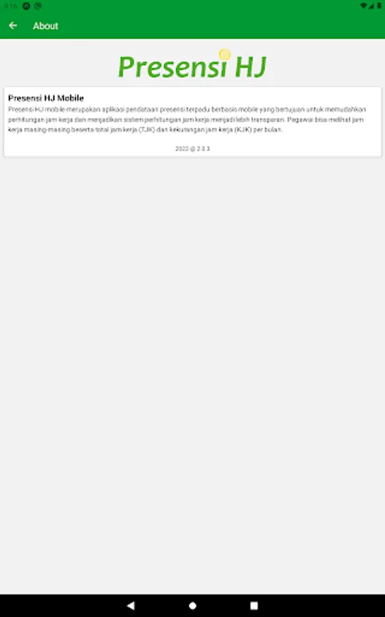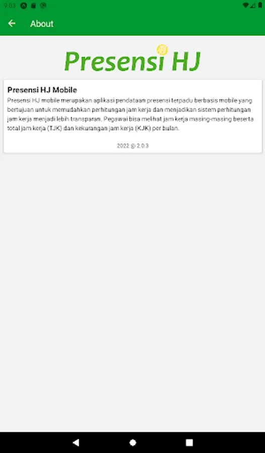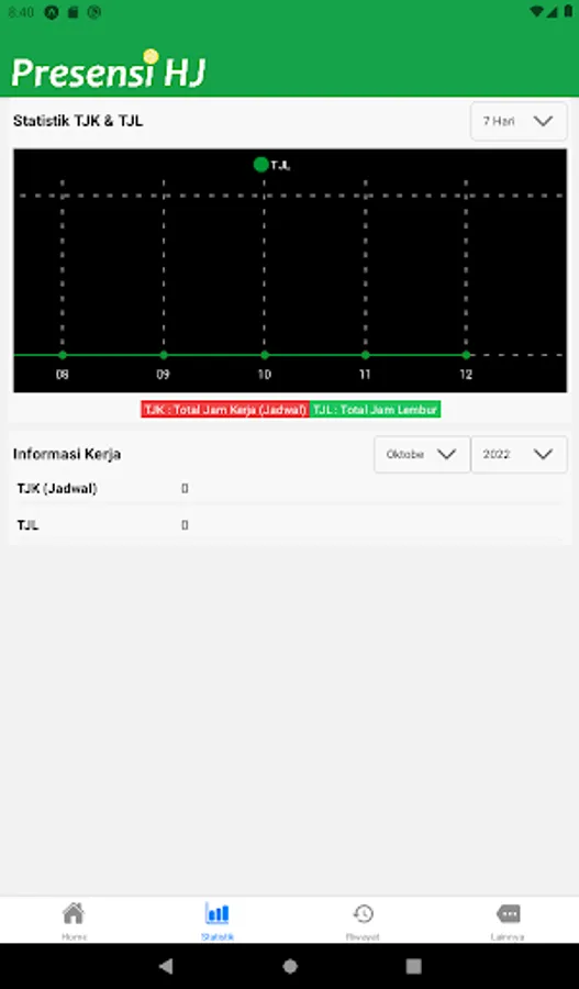 HJ Mobile Presence is an integrated mobile-based attendance data collection application that aims to facilitate the calculation of working hours and make the working hours calculation system more transparent. Employees can see their respective working hours along with the total working hours (TJK) and short working hours (KJK) per month.