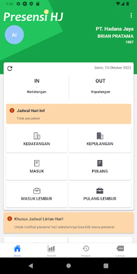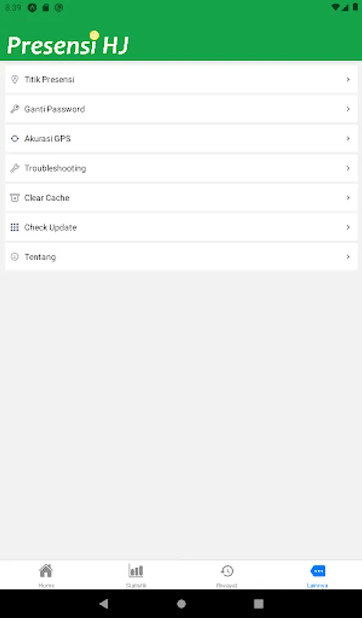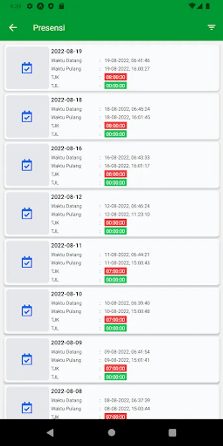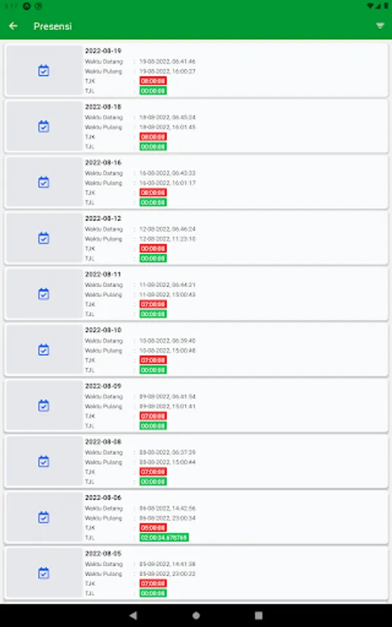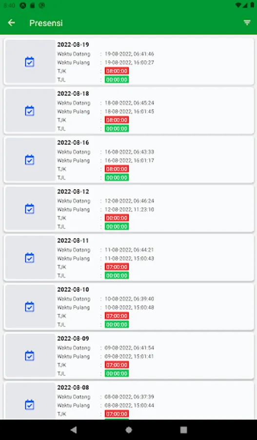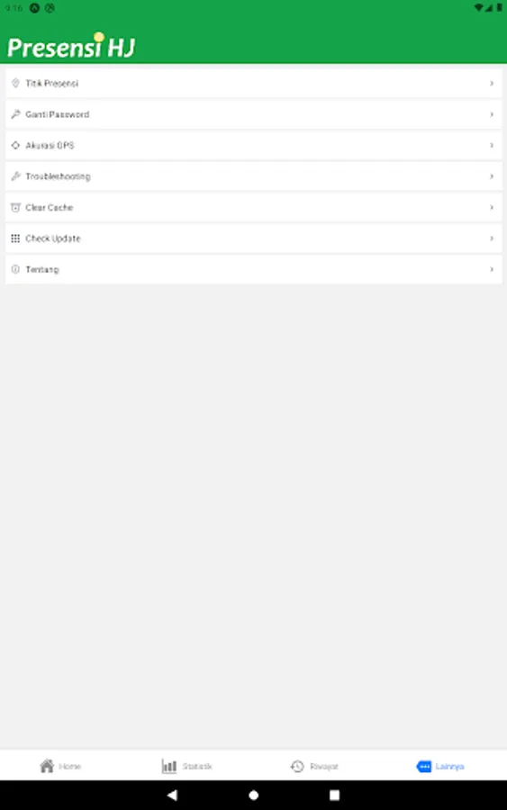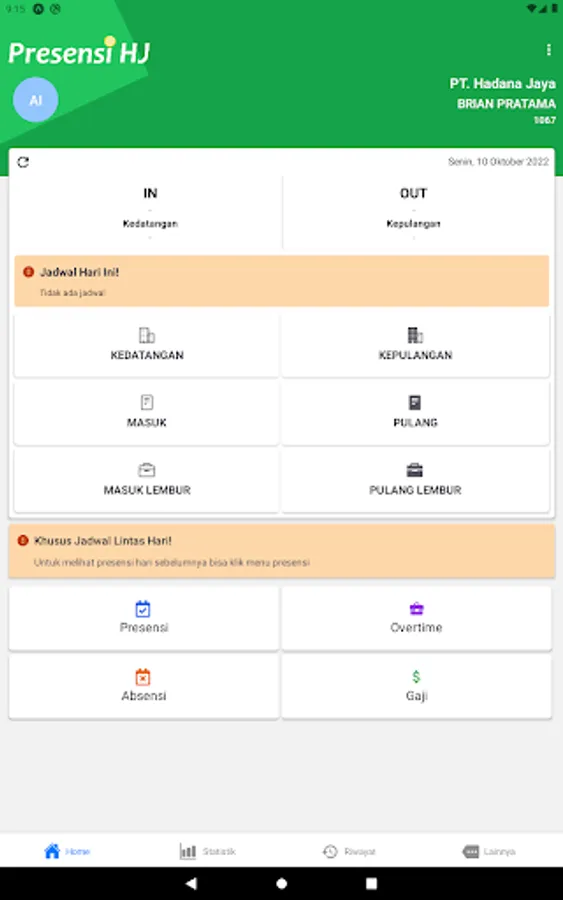 HJ Mobile Presence is an integrated mobile-based attendance data collection application that aims to facilitate the calculation of working hours and make the working hours calculation system more transparent. Employees can see their respective working hours along with the total working hours (TJK) and short working hours (KJK) per month.