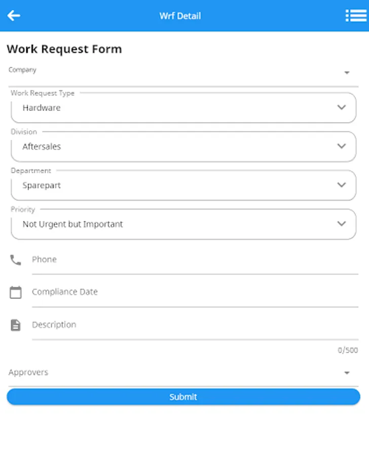 Aplikasi Work Request Form adalah sebuah aplikasi untuk menunjang dan memudahkan kegiatan operasional perusahaan, mencakup kemudahan mengumpulkan data formulir pengajuan pekerjaan.