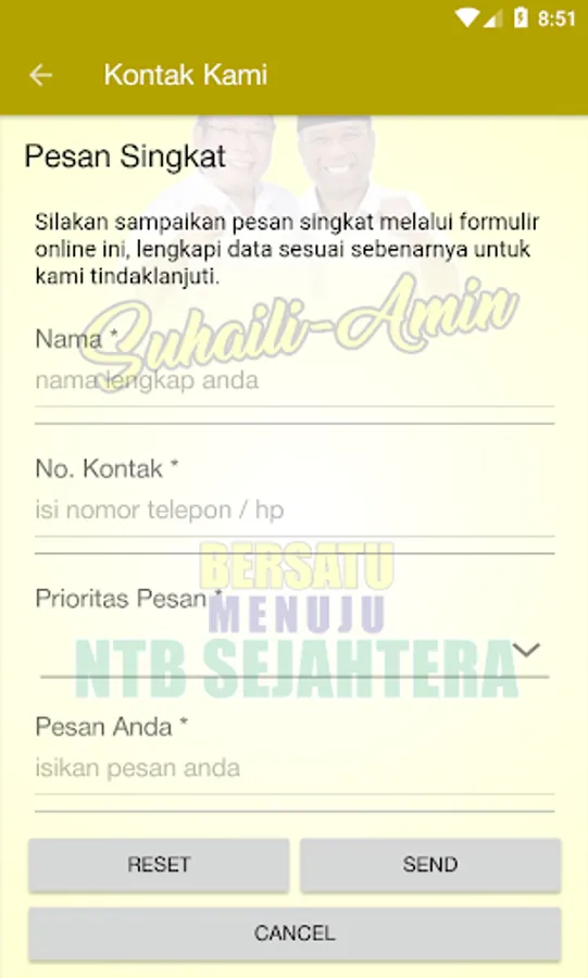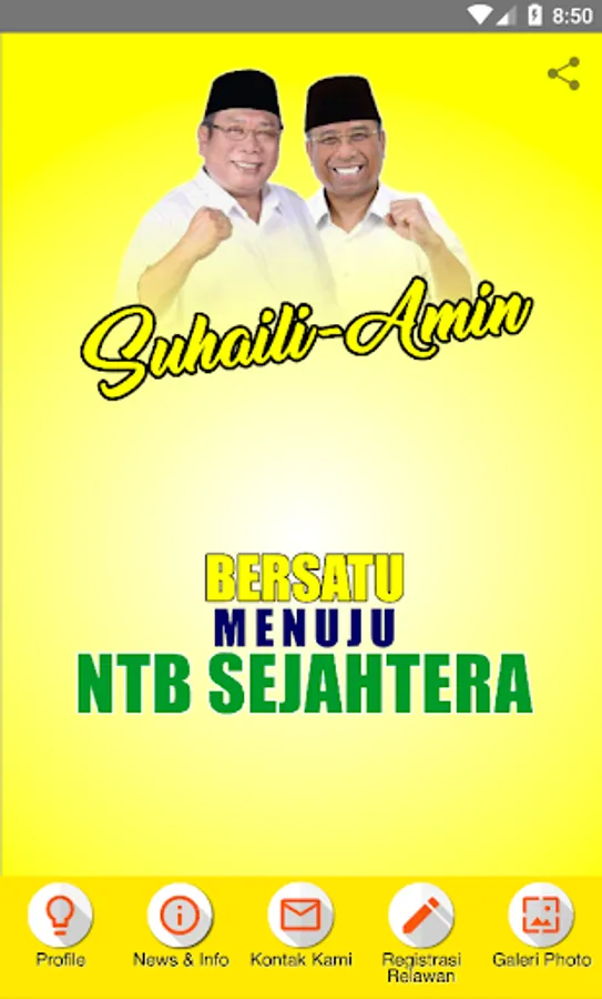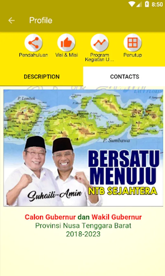 With this mobile application, it is expected that the Profile, Vision, Mission and Work Program of the pair of Candidates for Governor and Deputy Governor Suhaili - Amin can be accessed easily and quickly by all levels of society so that it can help provide enlightenment to all people towards Towards a Prosperous NTB.