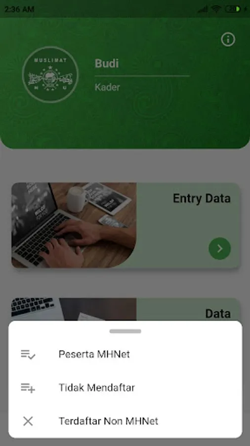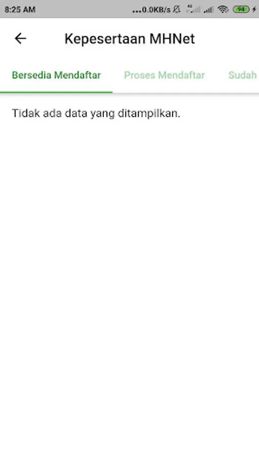 Daftar kepesertaan ditampilkan berdasarkan pengelompokan data: Peserta MHNet, Tidak mendaftar dan Terdaftar Non-MHNet.