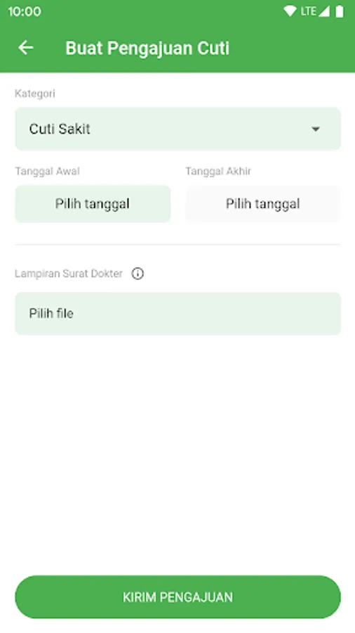 Each employee can manage permits and leave in the form of making permit and leave applications, edit applications and delete applications that have not been verified. Permission and leave categories can be selected from the category column, each submission in the form of an employee's Pain Permit must attach a scan of the doctor's permission letter to be attached to the submission.