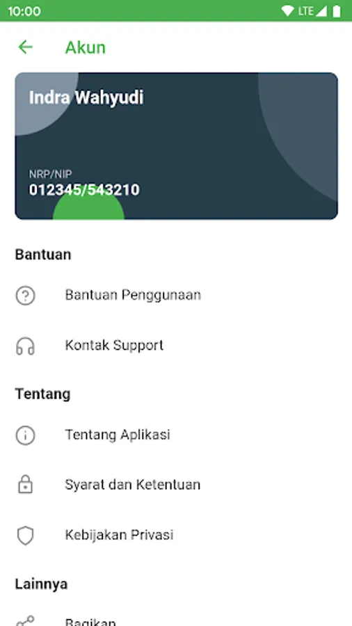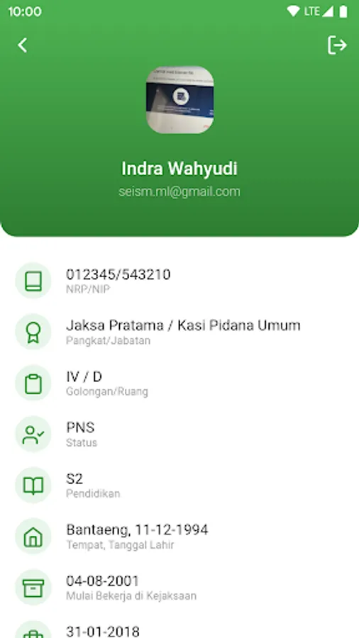 Employee account access to view employee details in the form of Name, NIP / NIP, Rank and Position, Gologan / Space, Education and Commencement Date.