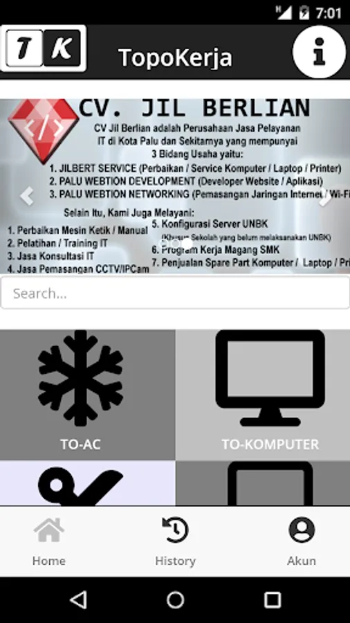 TopoKerja is a Marketplace for ordering services from Service Workers who have partnered with Topo Kerja ...