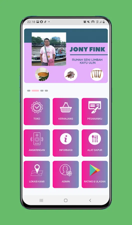 Jony fink store is a shop with handicraft products from ironwood waste in the form of plates, mortar, etc. and has a fink cafe which is crowded with visitors in the village of Batakan, Tanah Laut Regency.