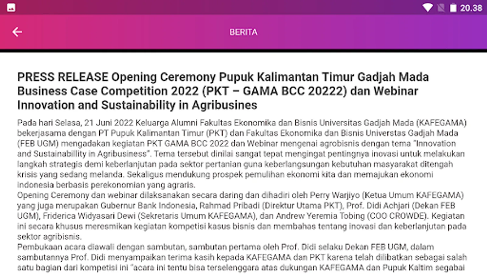 Since its establishment on September 19, 1955 the Faculty of Economics and Business, Gadjah Mada University (FEB UGM) with the Decree of the Minister of Education and Culture No. 53759/Kab, FEB UGM has a very large number of alumni spread throughout Indonesia and many countries in the world, and holds important positions in government, BUMN, and the private sector. In order to realize the dedication to the alma mater alumni, FEB UGM formed an alumni organization with the name Alumni Family of the Faculty of Economics and Business, Gadjah Mada University (KAFEGAMA).