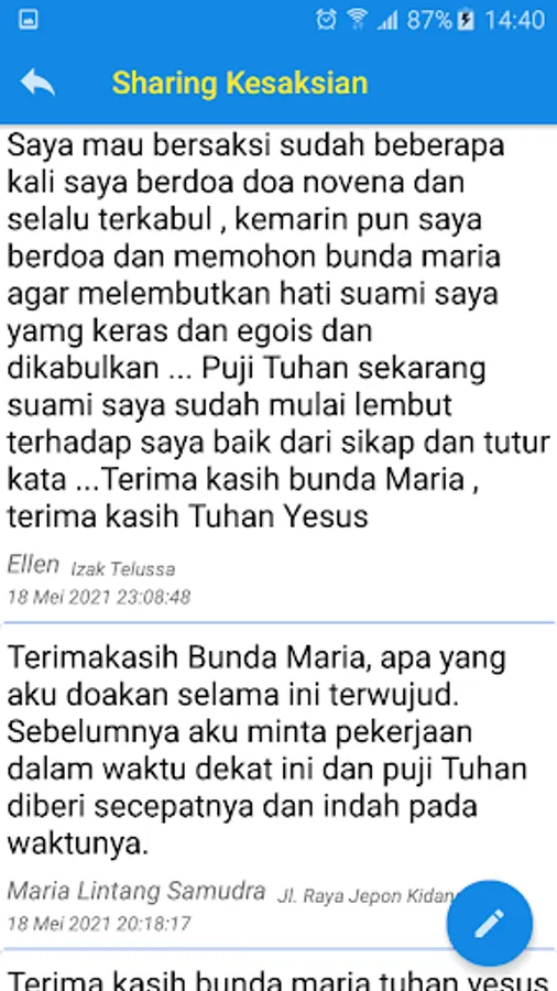 Equipped with sharing experiences from anyone who wants to write about sharing their experiences from doing the Novena Tiga Hail Mary prayer and the experience of being granted their prayers to God through the intercession of the Mother Mary's prayer. To strengthen each other in reverence for Our Lady.