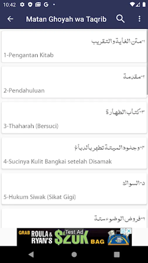 Yang Mewajibkan Mandi Besar, Wajib dan Sunnahnya Mandi, Keadaan yang Disunnahkan Mandi, Mengusap Khuf (Kaus Kaki) ,Tayamum: Syarat, Rukun, Sunnah, Pembatal Tayamum ,Najis, Haid, Nifas, Istihadoh, Haram sebab Haid dan Nifas, Haram sebab Junub, Haram sebab Hadas Kecil, Shalat, Shalat Lima Waktu, Syarat Wajib dan Shalat Sunnah