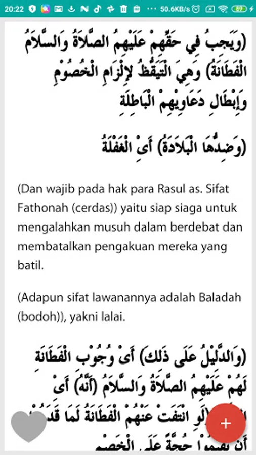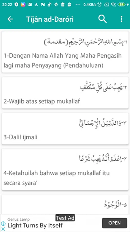 20 Sifat wajib bagi Allah, 20 sifat mustahil bagi Allah, Sifat wajib dan Mustahil bagi Rasul, dan Sifat Jaiz bagi Allah dan Rasulnya.