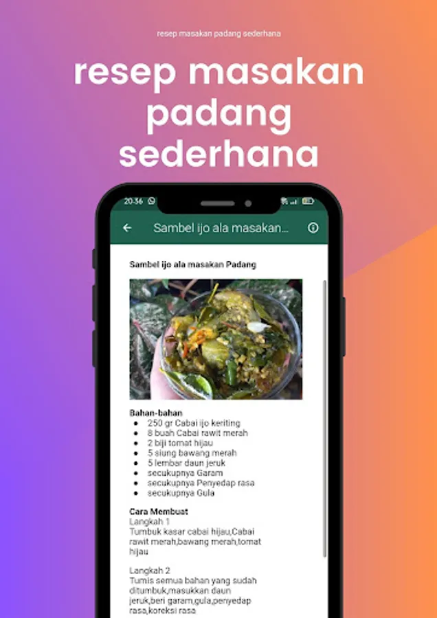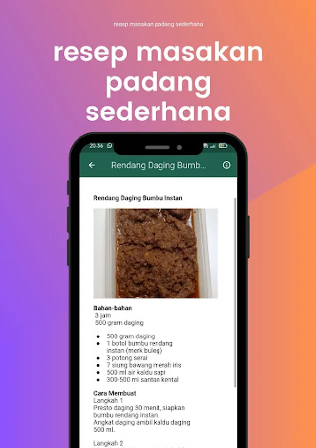 The Padang recipe application is an application that contains various kinds of typical Padang recipes which are very popular in Indonesia. This application offers a variety of Padang recipes, from rendang, curry, satay, balado, beef jerky, and many more.