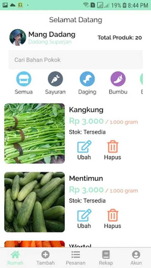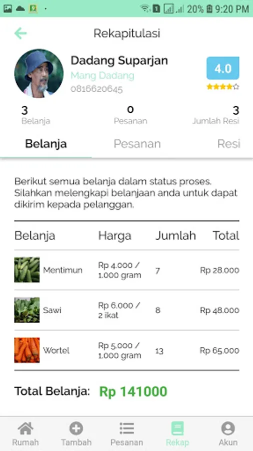 The mang sayur seller application was created to make it easier for vegetable mangers to read how much groceries and orders to buy, turnover, receipts, and others.