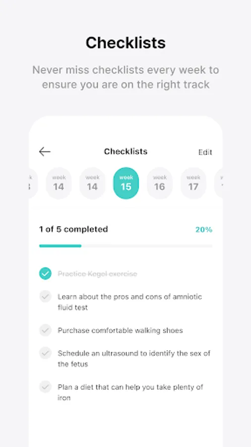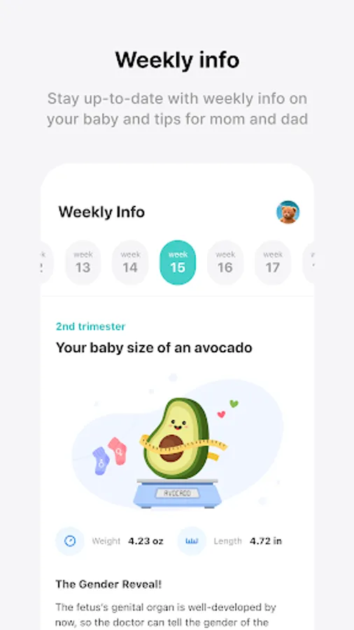 • Check all the important milestones during your pregnancy, such as medical check-ups for you and your baby, body changes, and growth information!