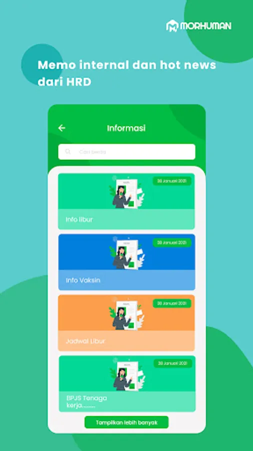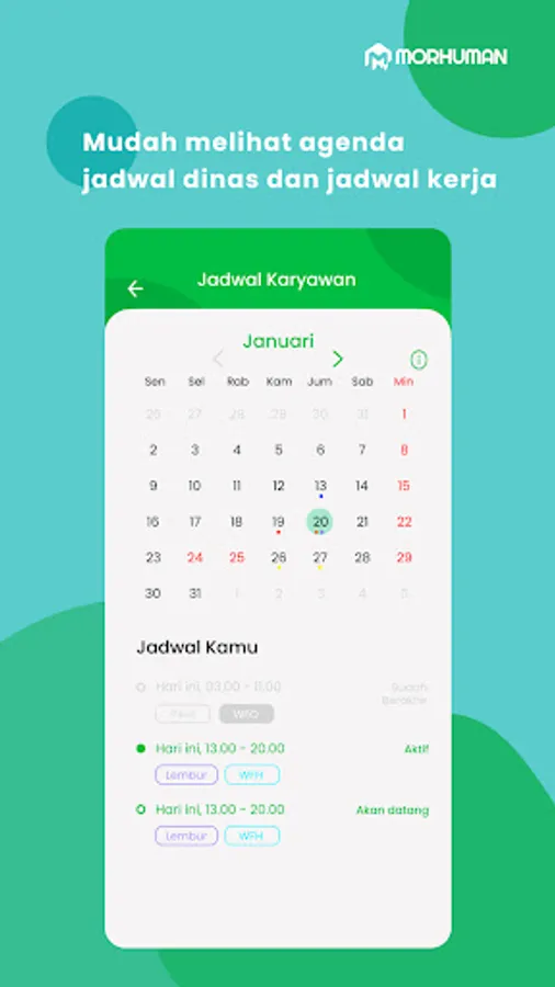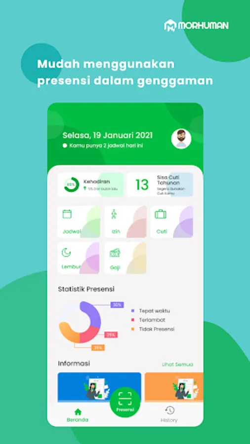 Morhuman is a solution to make it easier to monitor employee attendance, record attendance, provide official travel information, holiday information and employees can apply for leave through the application