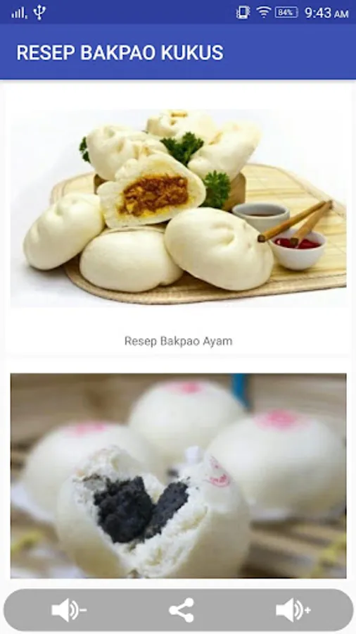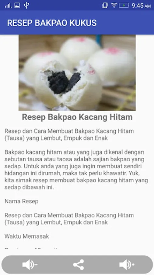 Ada juga tambahan fitur pengaturan volume suara yang bisa digunakan untuk membesarkan suara maupun mengecilkan suara tanpa memencet tomol hardware volume bawaan dari handphone. Ini sangat memudahkan buat pengguna dalam menggunakan aplikasi resep bakpao kukus ini. Ini juga berarti bisa membuat penggunaan handphone menjadi awet karena hardware volume bisa diatur secara software atau aplikasi di dalam aplikasi resep bakpao kukus ini.