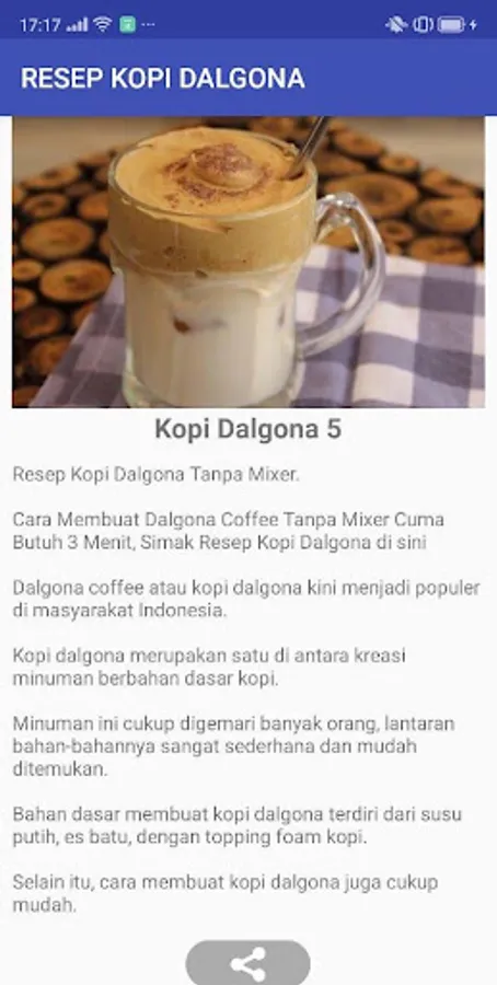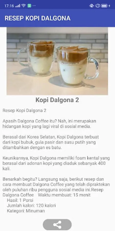 Aplikasi ini berisi resep cara membuat Kopi Dalgona yang enak dan nikmat dan saat ini sedang popular, tren dan viral di media sosial. Minuman kopi dagolna ini berasal dari Korea Selatan. Keunikan minuman kopi dalgina ini terdapat dalam cara penyajiannya di mana bahan kopi dibuat dengan cara dikocok menggunakan mixer sehingga menjadikan kenta dan menjadikan unik dalam penyajiannya.