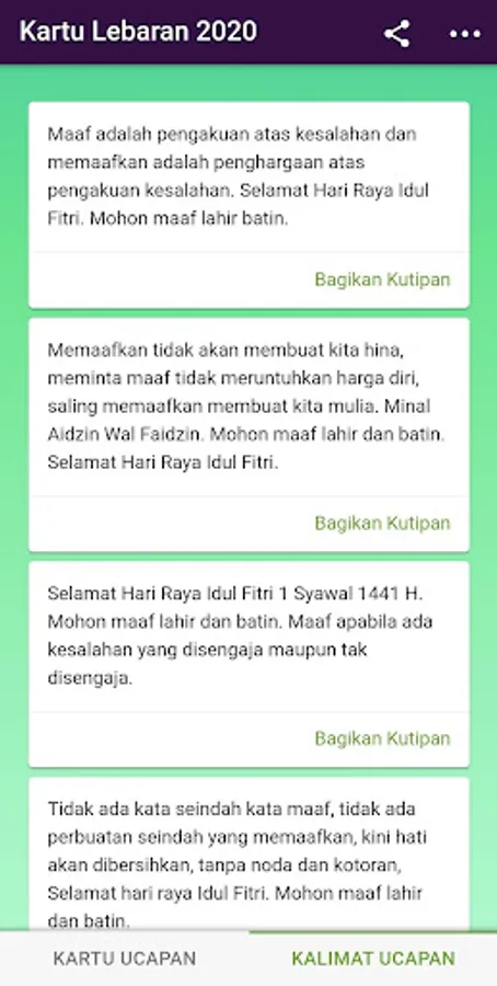 Eid Card 2020 application is an Android-based application that can help you to get the cards Eid congratulations and Eid. In this application available two types of speech formats, namely in the form of greeting cards and sentences in the form of sentences.