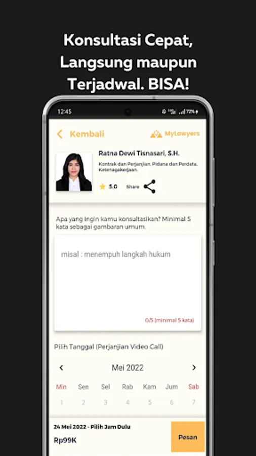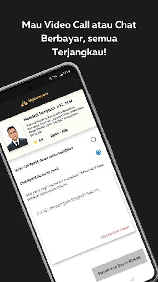 Chat or Video Call consultations are all done directly in the Application. You are free to discuss anything to find the required legal solution, our lawyers / legal consultants are ready to serve.