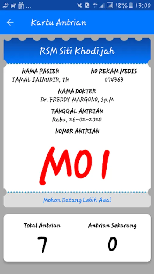 Untuk bisa login Ke Aplikasi ini, pasien harus datang dan Mendaftar langsung ke Bagian pendaftaran RSM Siti Khodijah dengan membawa KTP/KK untuk mendapatkan Nomer Rekam Medis yang nantinya Nomer RM dan Nomer KTP tersebut digunakan untuk login ke Aplikasi.