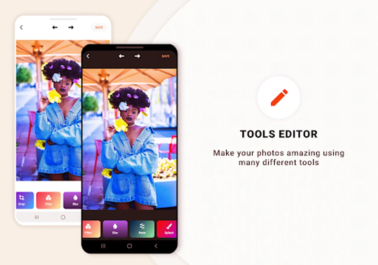 Photo editor pro offers you a set of cool tools like “Drip effect – Neon effect – Wing effect – Filters – Motion effect – Drip Art effect – Splash & Blur effect …” that helps you create an eye-catching image.