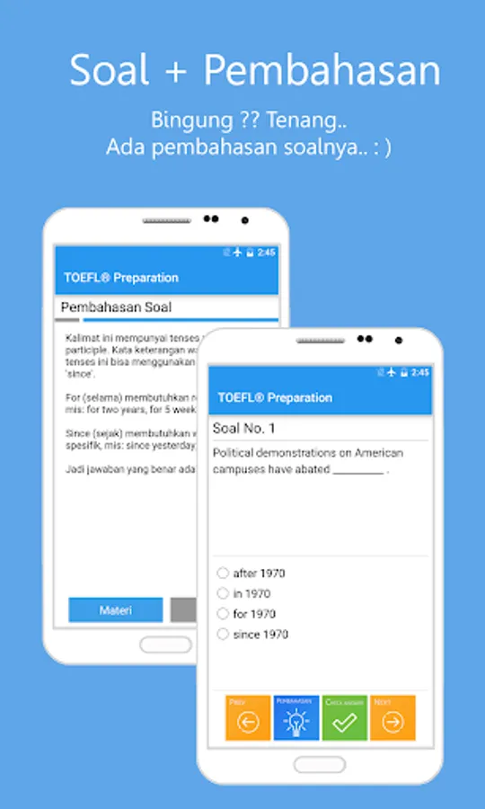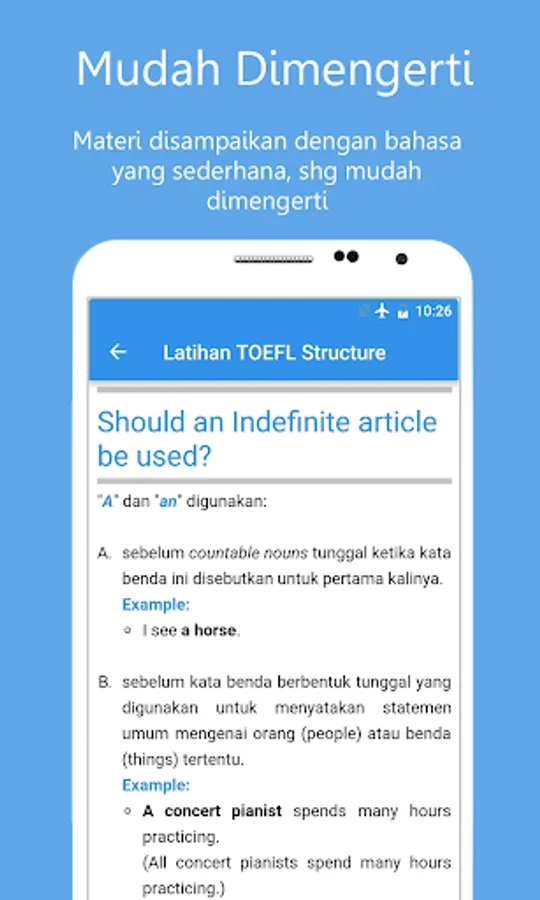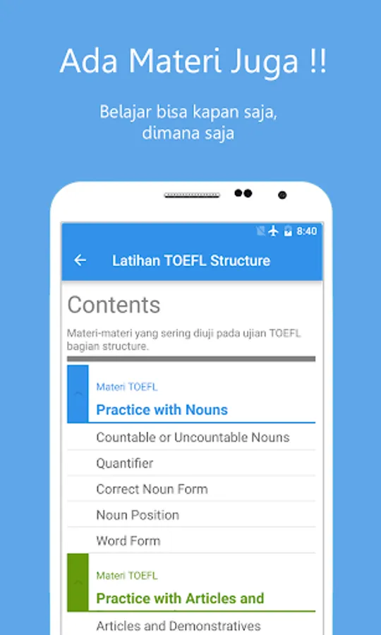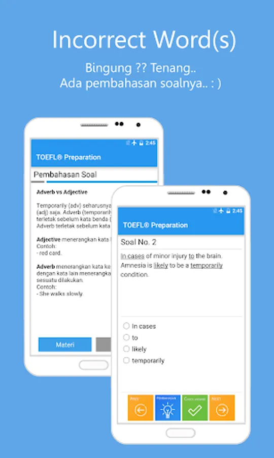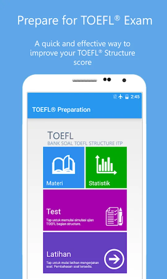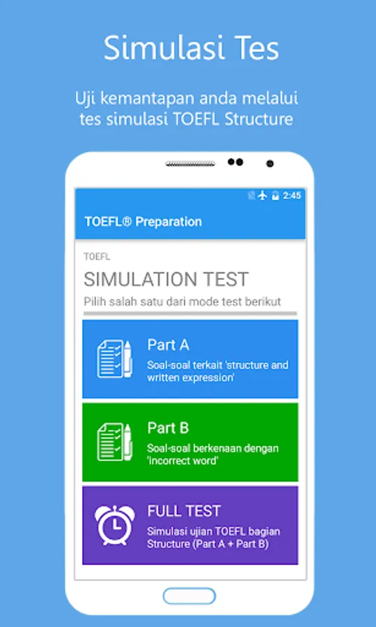 Applikasi ini bertujuan untuk membantu Anda untuk berlatih structure kapan saja dan dimana saja Anda berada. Anda dapat melatih sejauh mana kemampuan anda untuk 'Part A: Incomplete sentences' maupun 'Part B: Incorrect words' secara terpisah dan melihat pembahasannya. Apabila anda sudah yakin dengan kemampuan anda, ujilah melalui tes simulasi yang juga disediakan.