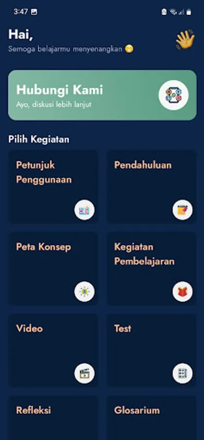 In the main menu of the application, there are menu options for instructions for use, introduction, concept maps, learning activities, videos, reflections, tests, glossaries, bibliography and contact us. Users can open the application offline but there are several menu options that must be connected to the internet (online) in its use, such as the video and test menus.