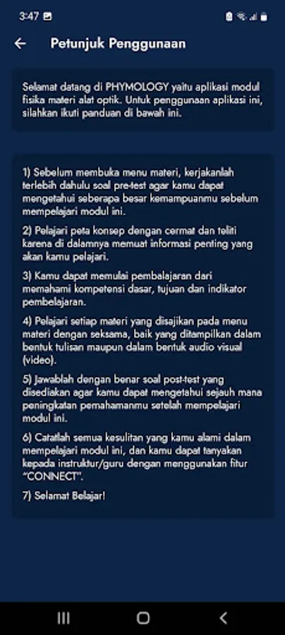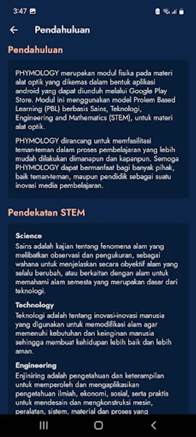 PHYMOLOGY is a physics module on optical instrument material that is packaged in the form of an android application. This module uses a Problem Based Learning (PBL) model based on Science, Technology, Engineering and Mathematics (STEM). PHYMOLOGY is designed to facilitate friends in the learning process that is easier to do anywhere and anytime.