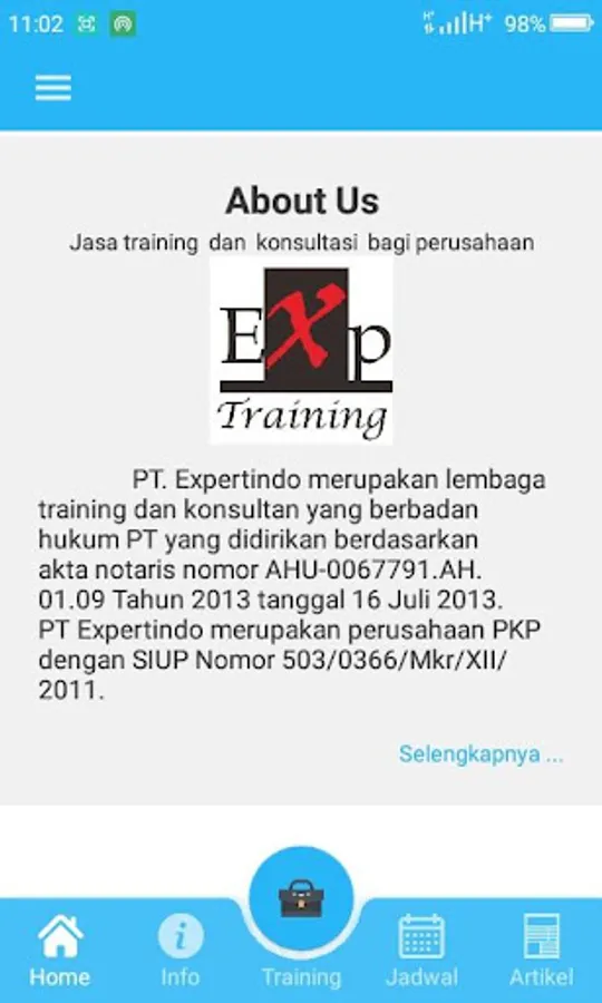 Android application owned by PT Expertindo Training for information and updated training schedules for various training titles and categories