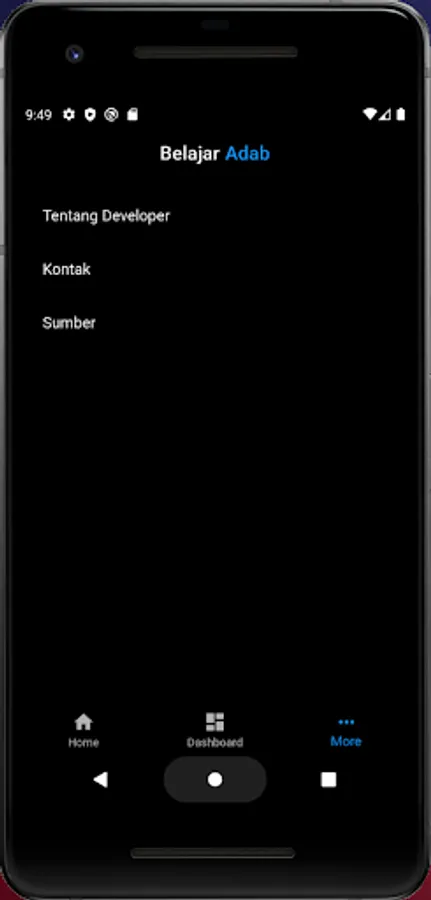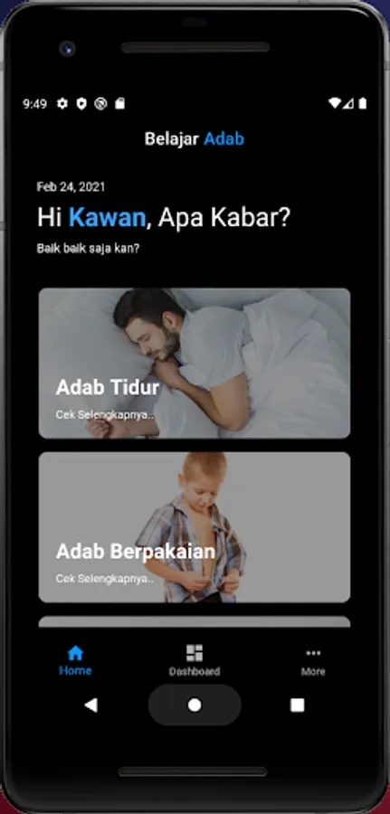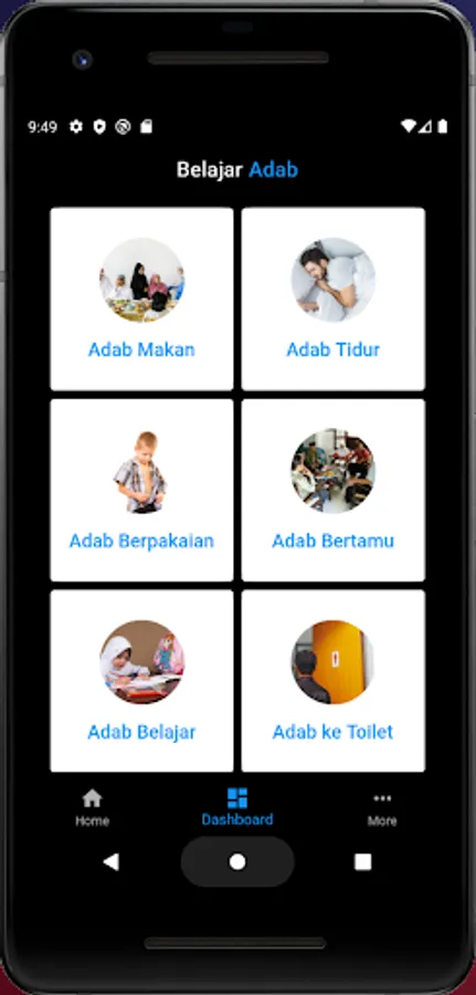 Aplikasi ini berisi mengenai belajar adab adab sehari hari. Seperti adab tidur, adab makan, berpakaian.