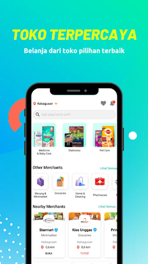 Shop for daily necessities from our hub or the nearest store partner from your place. Thousands of products available. We work with many store partners not like Astro, Bananas, Dropezy, Radius, Tokopedia Now