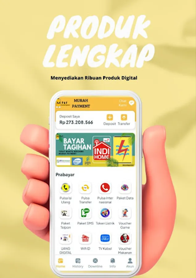 Check balance & account information, check real-time prices, register downline feature, transfer balance to downline menu, add balance, check transaction history, print receipts, app lock feature, etc.