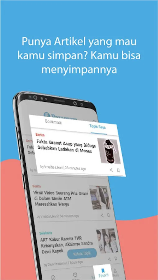 #Favorit: fitur ini terbagi menjadi dua bagian. Pertama, "Bookmark" yang memungkinkan kamu memberi 'bookmark' untuk konten yang kamu sukai. Kedua, "Topik Saya" bisa kamu pilih untuk menyaring berita serta informasi yang ingin kamu ketahui.