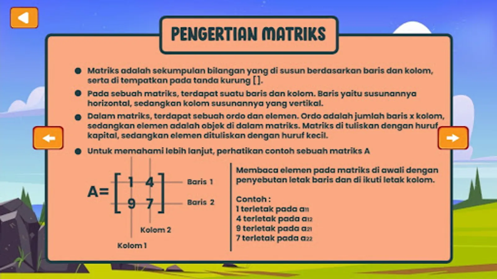 It is an interactive learning media for the XI SMA/SMK Mathematics class matrix chapter. This media material contains the basics of matrix mathematics, namely the types of matrices, matrix operations and matrix transpose
