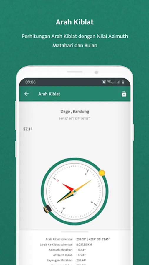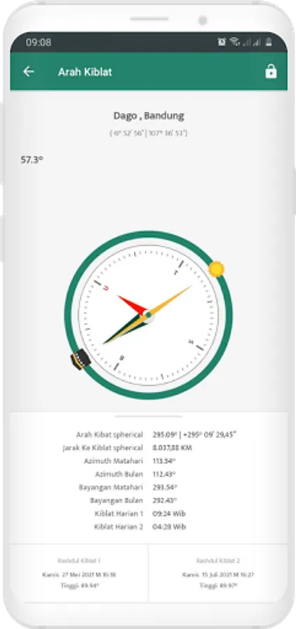 2. Qibla Direction (Spherical, Ellipsoid, Vincenty), Hourly Qibla Shadow either yearly (Rashdul Qiblat), daily Qibla shadow or Qibla Direction with sun and moon shadow per minute basis.