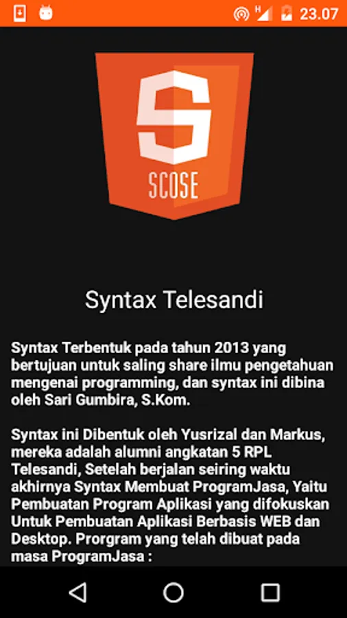 Here you can find out everything about Syntax Telesandi, on application, history and more .. and here you can also know more about Syntax and applications that have been created by Syntax Telesandi, Biar guns curious please download the app :)