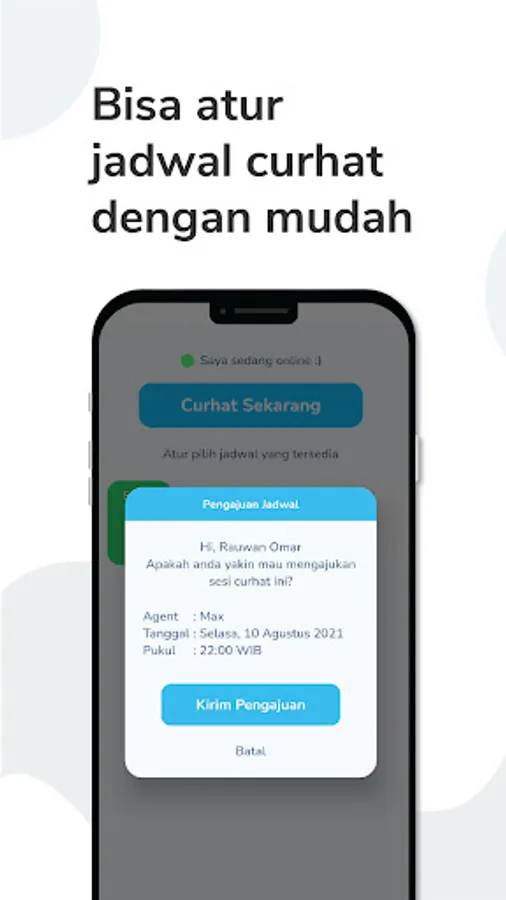 Untuk curhat online: Aplikasi Teman Curhat dilengkapi dengan fitur chat, audiocall, dan videocall langsung di aplikasi tanpa perlu pindah menggunakan aplikasi lain. Sedangkan untuk curhat tatap muka (offline): Aplikasi Teman Curhat dilengkapi fitur booking appointment untuk membuat janji bertemu dengan agent professional.