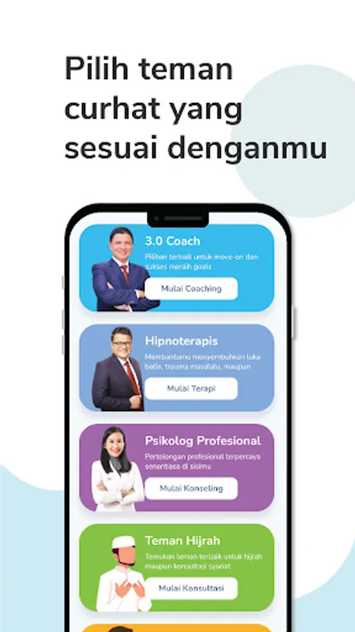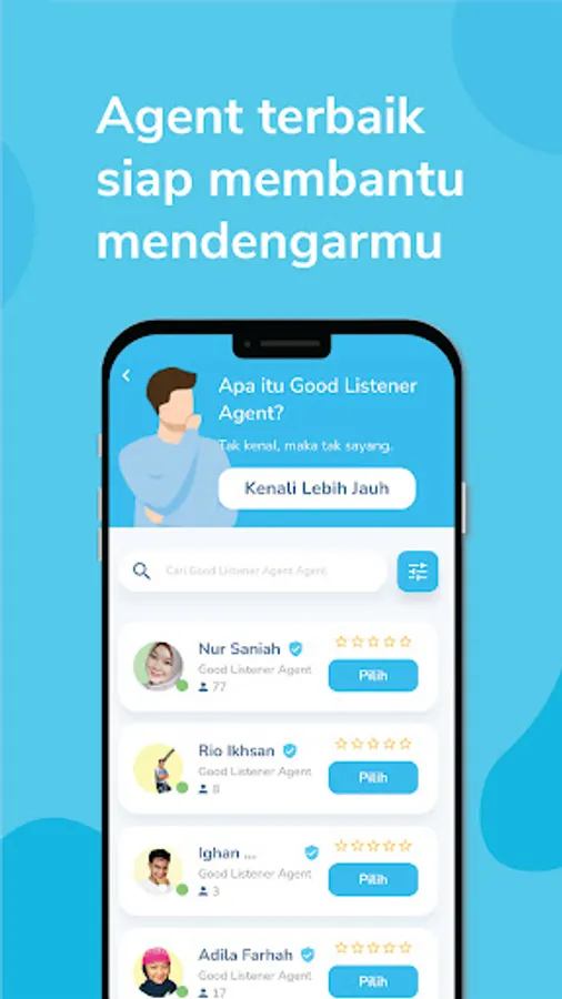 Para agent professional yang terdiri dari Psikolog, Life Coach, Hipnoterapis, Konsultan Keuangan, Konsultan Hukum, Apoteker, dan bahkan ada Ustadz/Ustadzah.