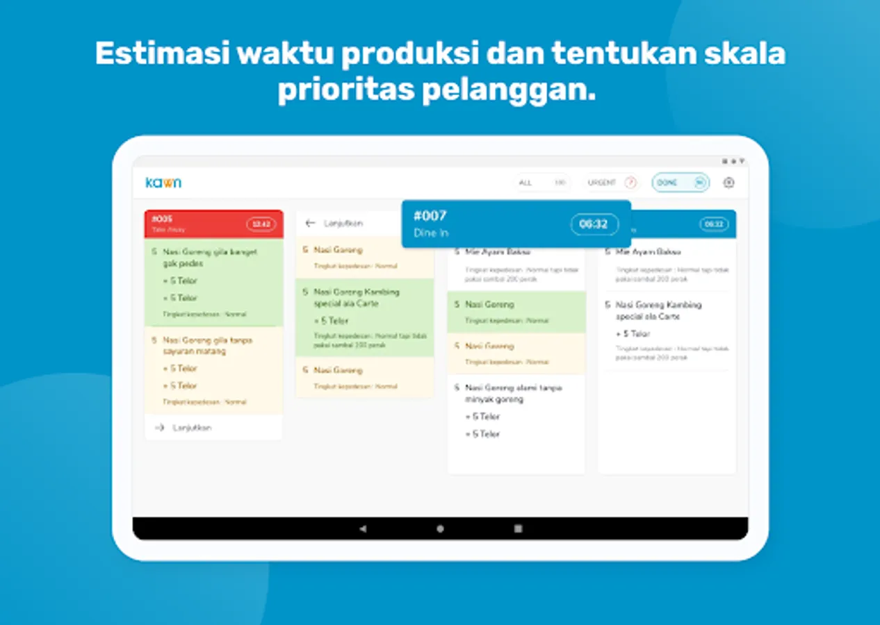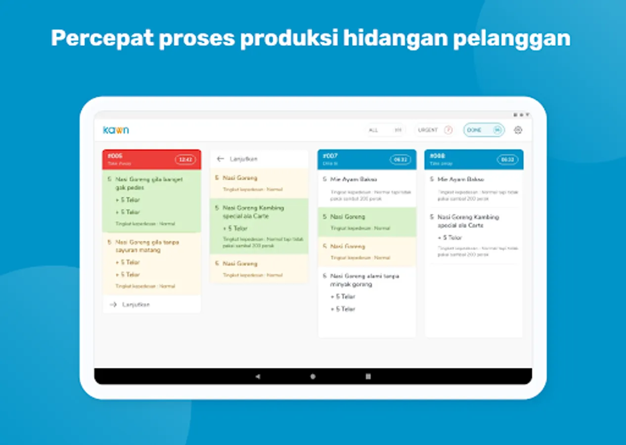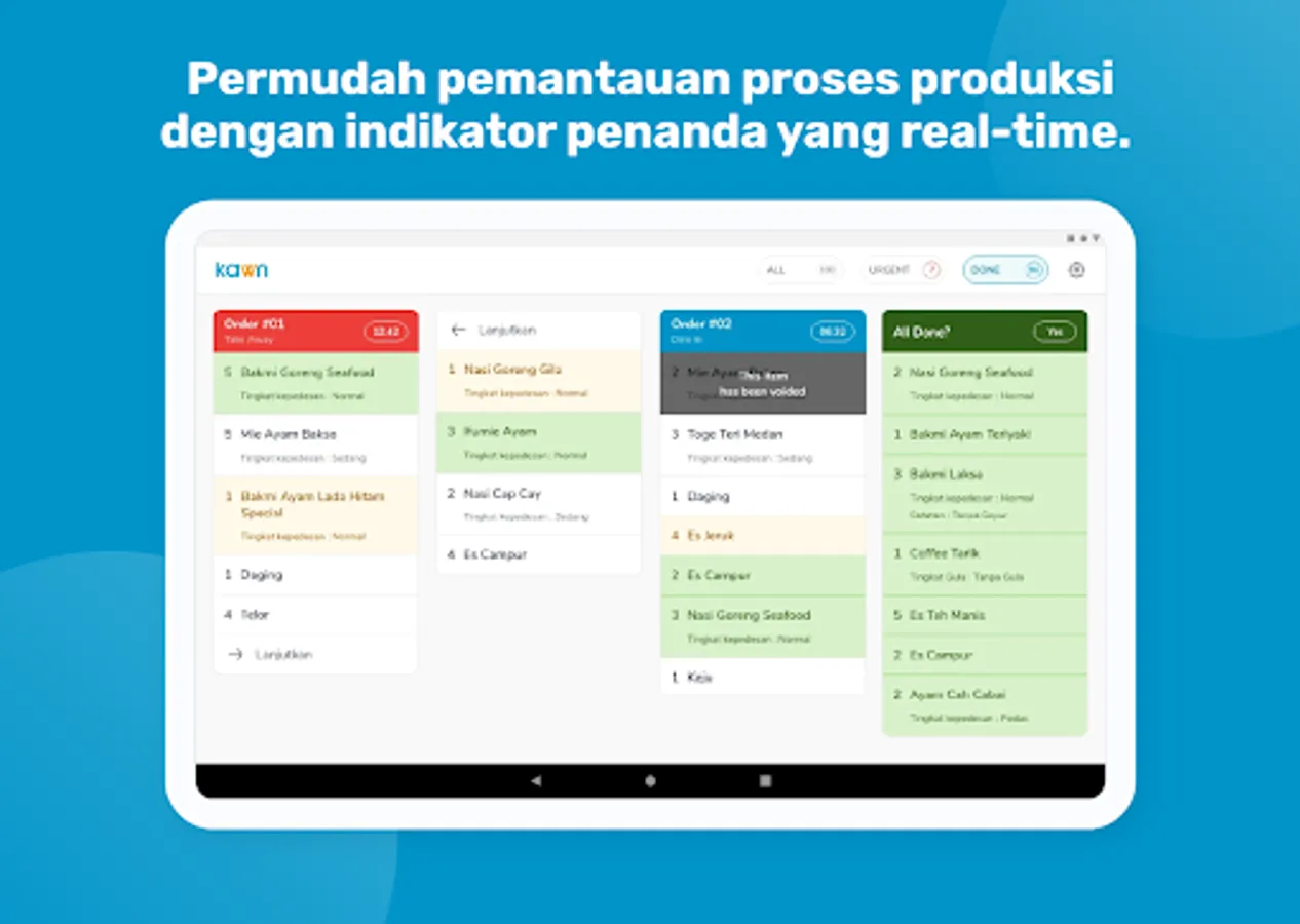 Dengan KAWN Dapur, tablet dan aplikasi kasir KAWN Anda kini bisa terhubung secara real-time dengan tablet di dapur, sehingga setiap Order yang masuk dapat segera muncul dan diproses oleh dapur Anda secara cepat, tepat dan efisien!