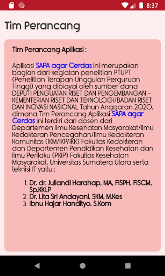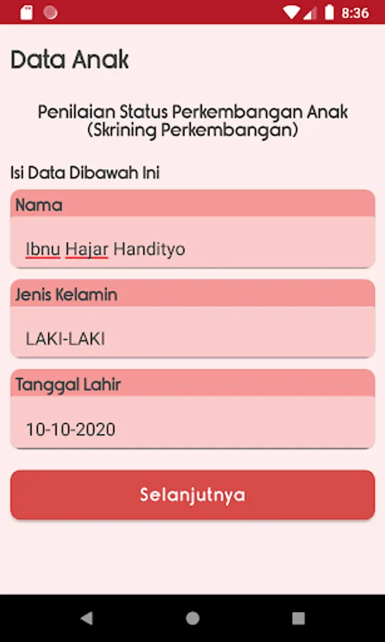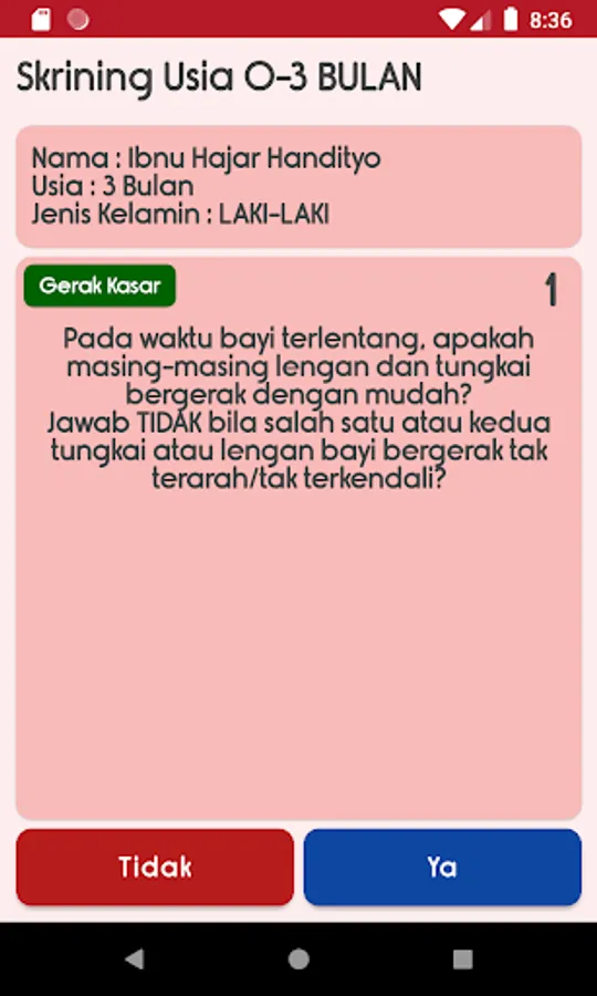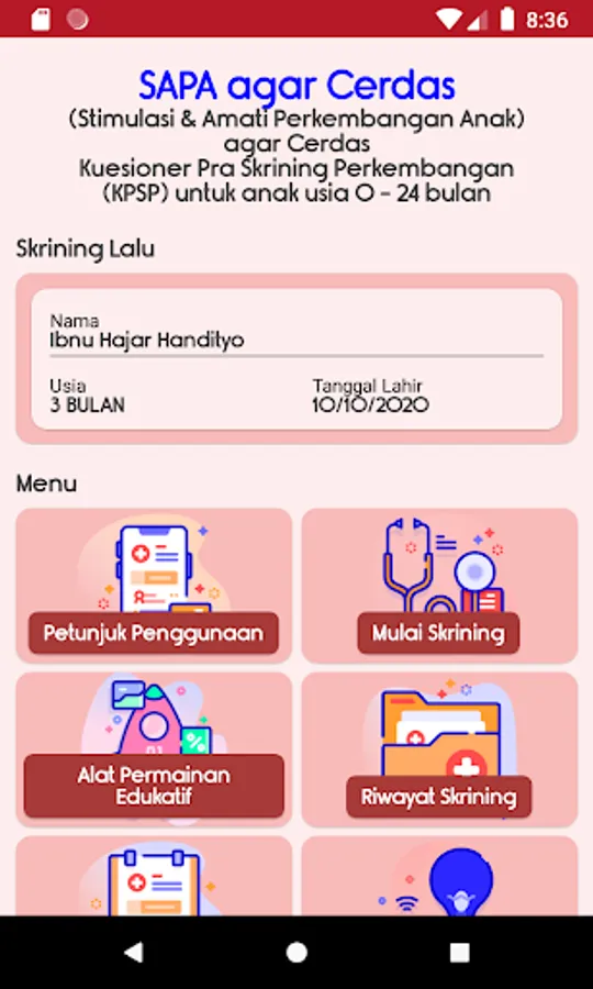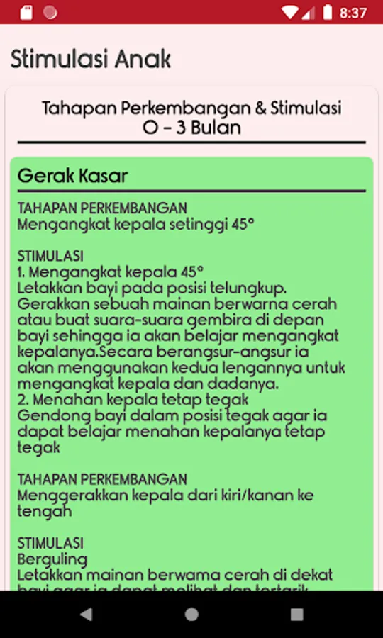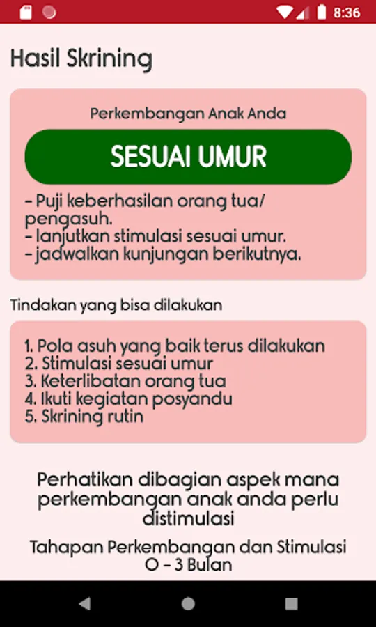 This application is useful for knowing the development of children, especially for ages 0-24 months and knowing how to stimulate children's development so that development runs according to the stages of their age or catching up with children's development if the results of observations indicate that there are dubious developments or developmental deviations. The right stimulation will stimulate the toddler's brain so that the development of movement, speech and language skills, socialization and independence in toddlers takes place optimally according to the child's age. In summary, the children's skills and intelligence will be optimal and of course the children will be smart. Hopefully this application is useful for creating smart Indonesian children.