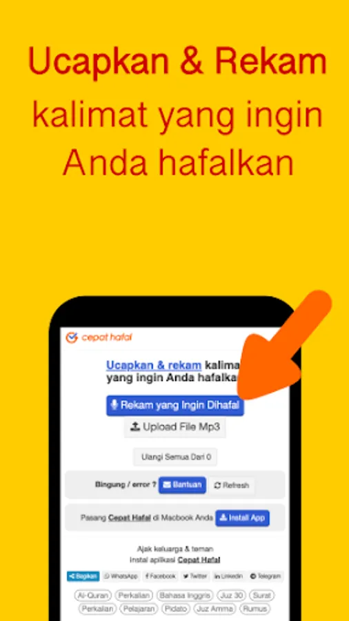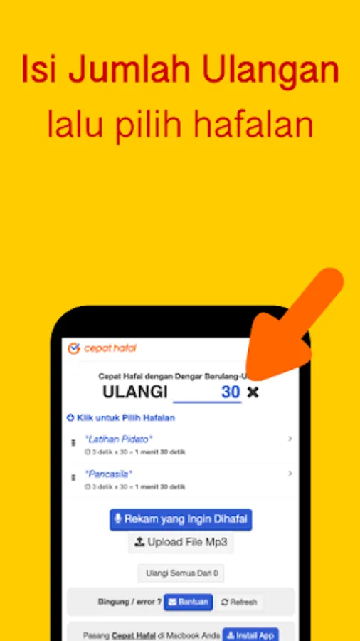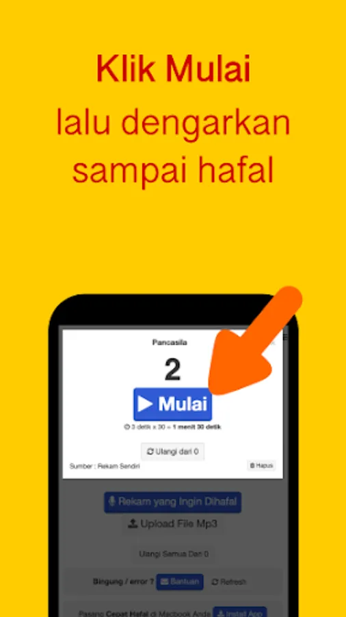 This application is designed to make it easier and faster for you to memorize Al-Quran, Multiplication, English, Juz 30, Surahs, Lessons, Speeches, Juz Amma, Formulas and so on just by recording the pronunciation once and then listening repeatedly.