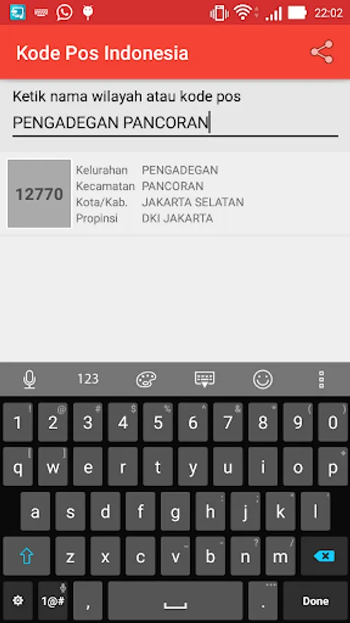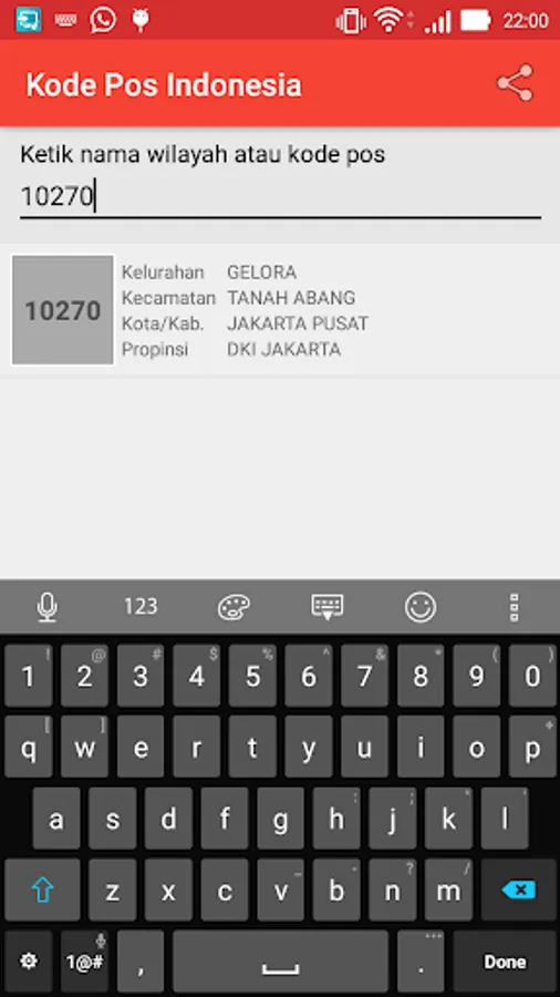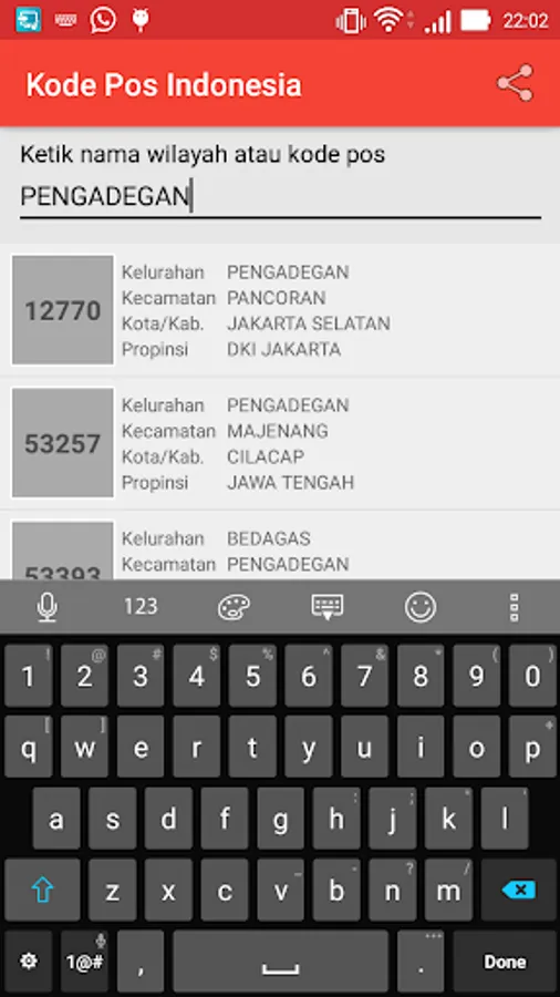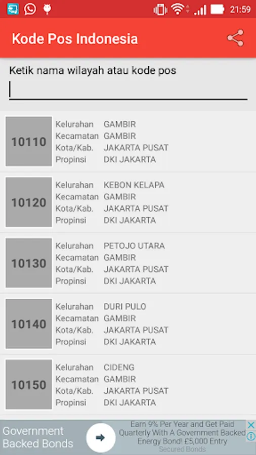 Pada saat dijalankan, aplikasi akan menampilkan semua data. Untuk mencari/memfilter data, Anda cukup mengetikan nama wilayah atau kode pos dari suatu wilayah maka data akan terfilter secara otomatis (sesuai dengan ap yang Anda ketik). Aplikasi tidak akan menampilkan apa-apa (kosong) jika hasil pencarian/filter tidak ditemukan.