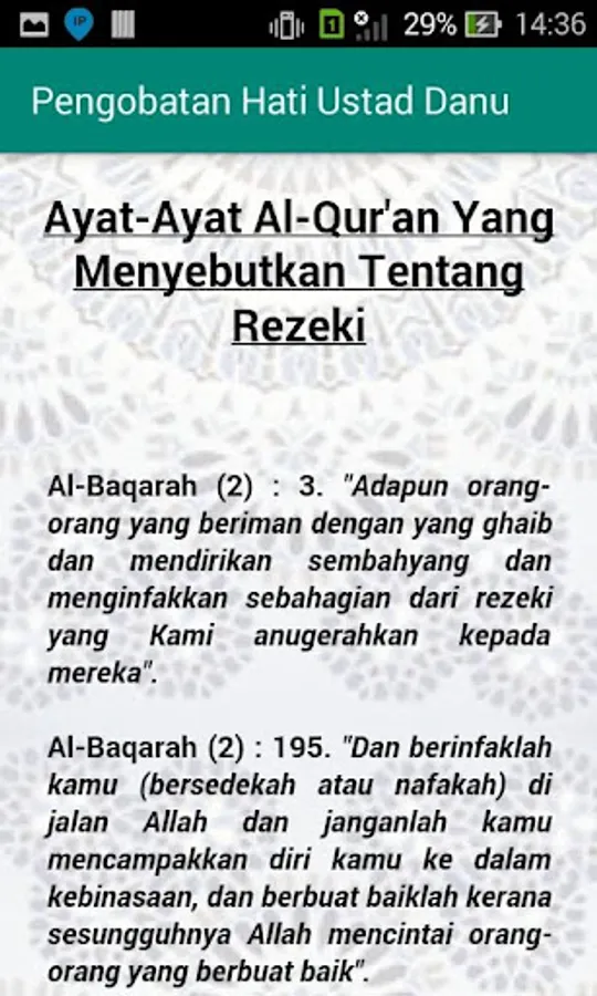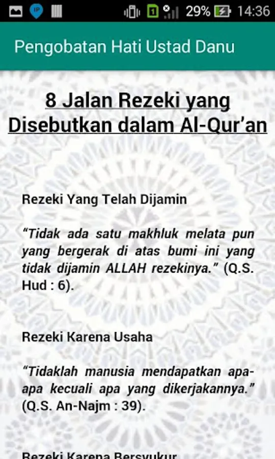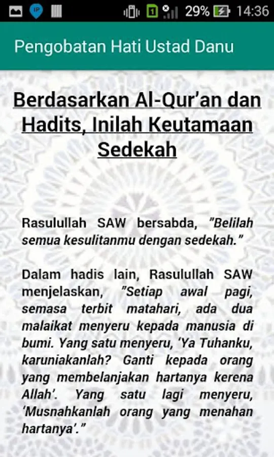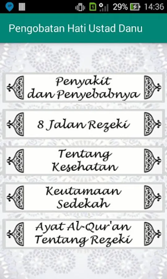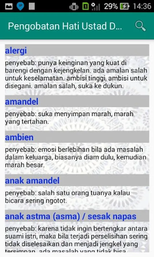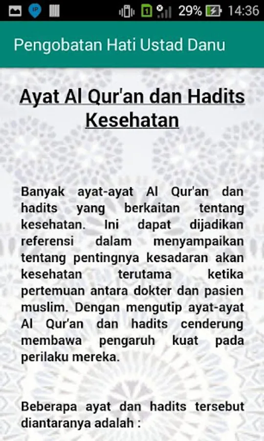 In addition to diseases and their causes, this application also provides information about health and fortune whose data comes from the Qur'an and Hadith.