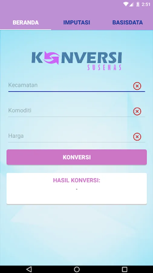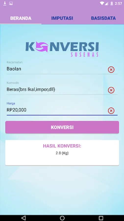 This Susenas conversion was made considering that sometimes when in the field it was found that respondents did not know the exact number or even forgot how many commodities were consumed during the past week, but the respondents only knew the total price. In addition, sometimes the respondent claims that the commodity he consumes is a gift or is assistance from the government but cannot be estimated. Here the susenas conversion application has a role in determining the estimated number of commodities consumed by the respondent.