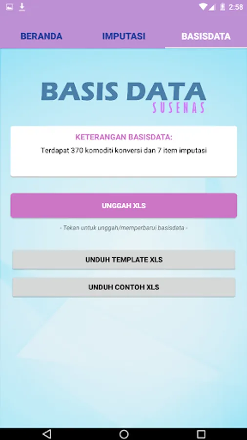This application uses the excel database (xls) so that all Regency / City BPS in Indonesia can adjust its database and can be used in their area. There are xls templates that have been provided in the application as a guide for formulating price conversions and item imputations. Of course, this formula will only be provided by the Head of Social Statistics or other authorized officials.