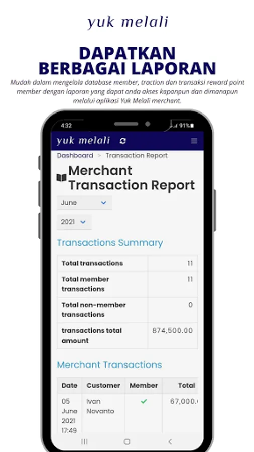 Easy to manage customers database, traction and customers member reward point transactions with reports that you can access anytime anywhere with Yuk Melali merchant apps.