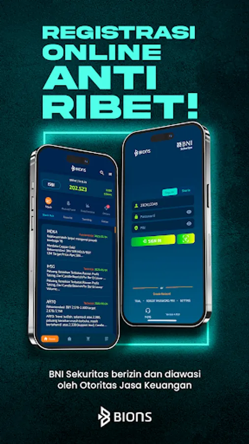 BIONS (BNI Sekuritas Innovative Online Trading System) merupakan platform multi investasi yang memberikan kemudahan untuk kamu bertransaksi berbagai instrumen investasi seperti investasi Saham, Reksa Dana, Obligasi (Primary Market), EBA RItel, dan SBN (Surat Berharga Negara) secara online dan dalam satu aplikasi yang aman, mudah, terpercaya, dan real time.