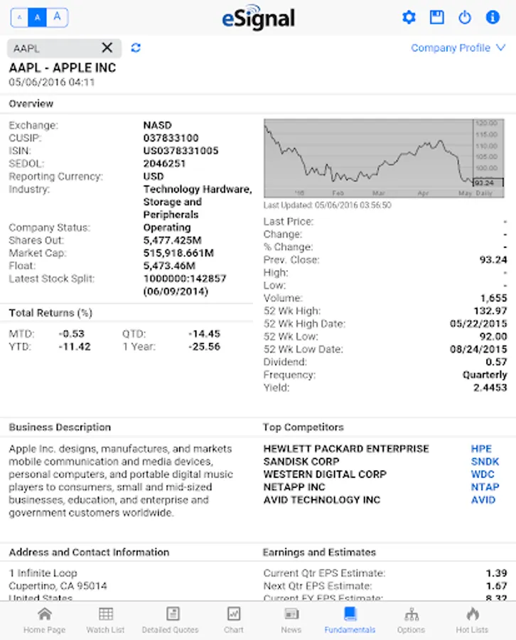 Fundamentals – Comprehensive tearsheet profiles for stock, ETF and mutual fund securities provide fundamental and reference data for investment evaluation.