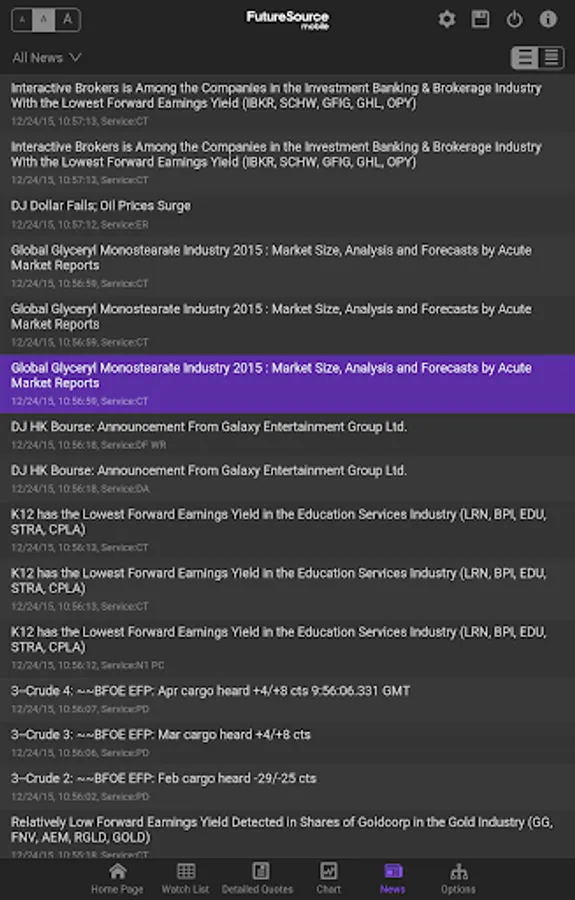 News - streaming real-time news from respected sources such as Dow Jones. Additionally, you will have access to your saved news filters from your Futuresource desktop.