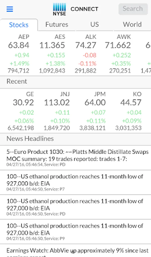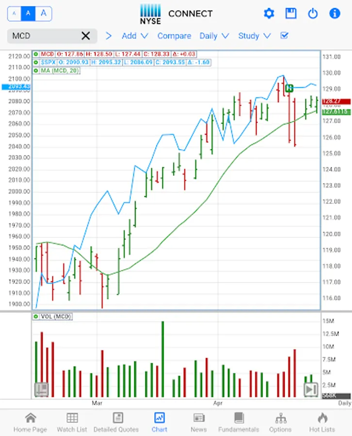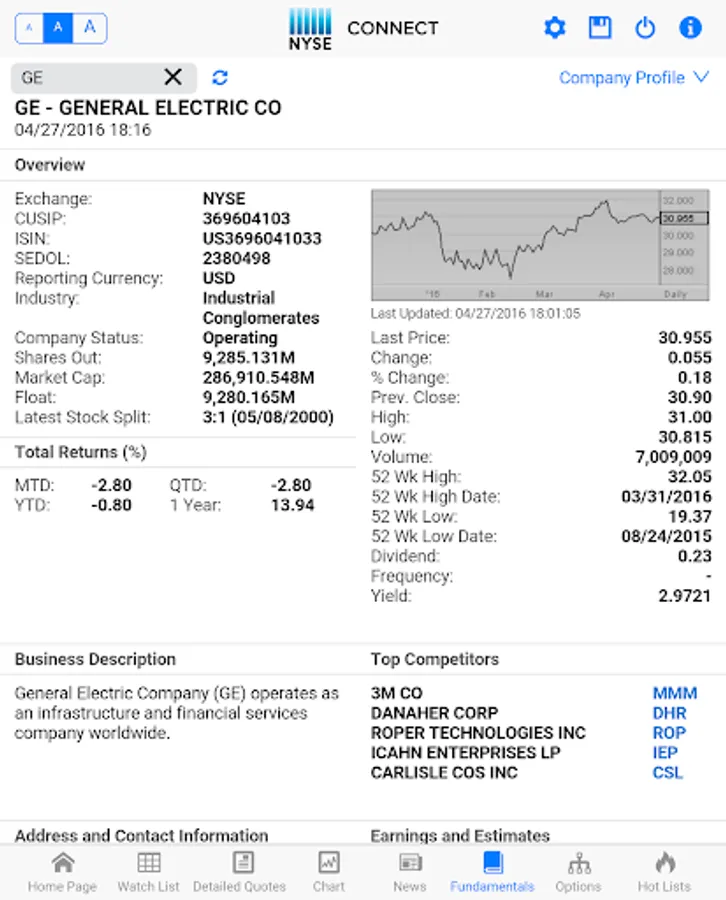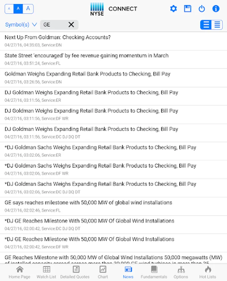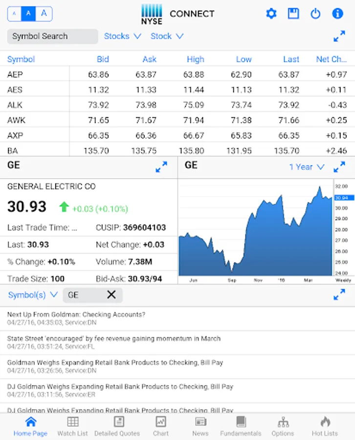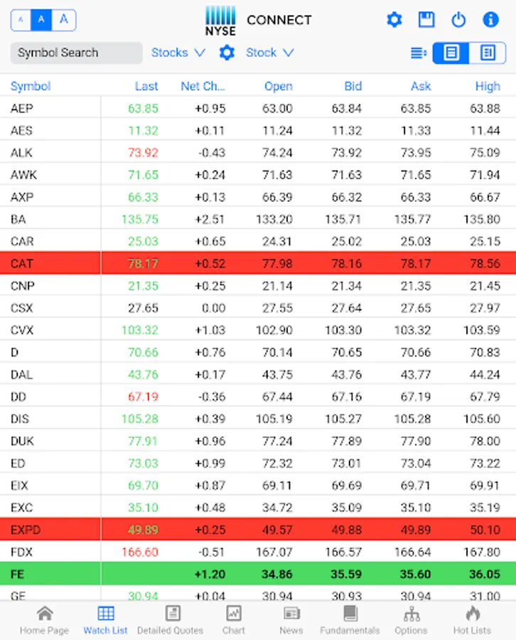 The NYSE Connect mobile apps allow subscribers access to the same streaming financial market pricing data, historical pricing data, fundamental data, news, charting, analytics found through its desktop counterpart. NYSE Connect’s portability provides a continuous cross device experience bringing your watchlists, filters and other shared preferences where ever you choose to access NYSE Connect.