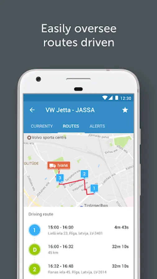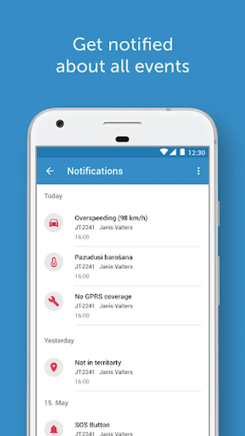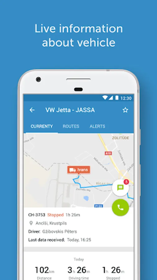 By using this mobile application you can access your vehicle data, follow their positions, routes, browse their route history, receive alerts about vehicles you have set up in web application.