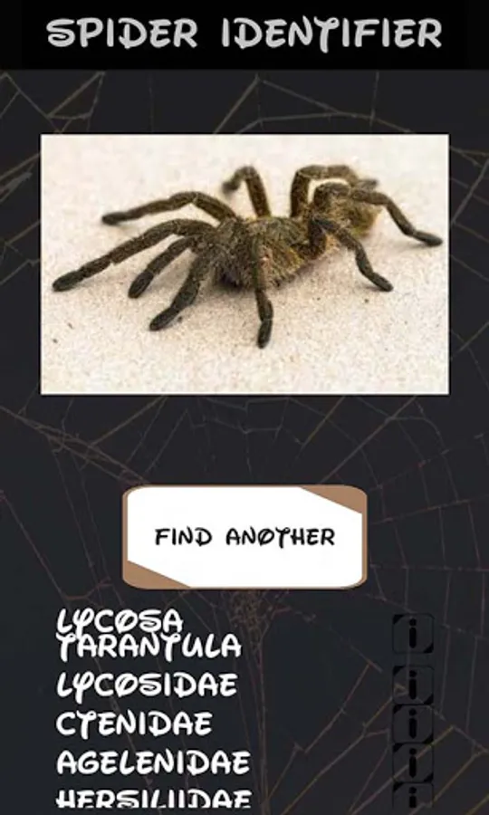 By taking photos or photos previously taken you can discover what spider it is, a classification will appear with the five scientific names that are most similar, by pressing the corresponding button you can directly find all the information on the internet.